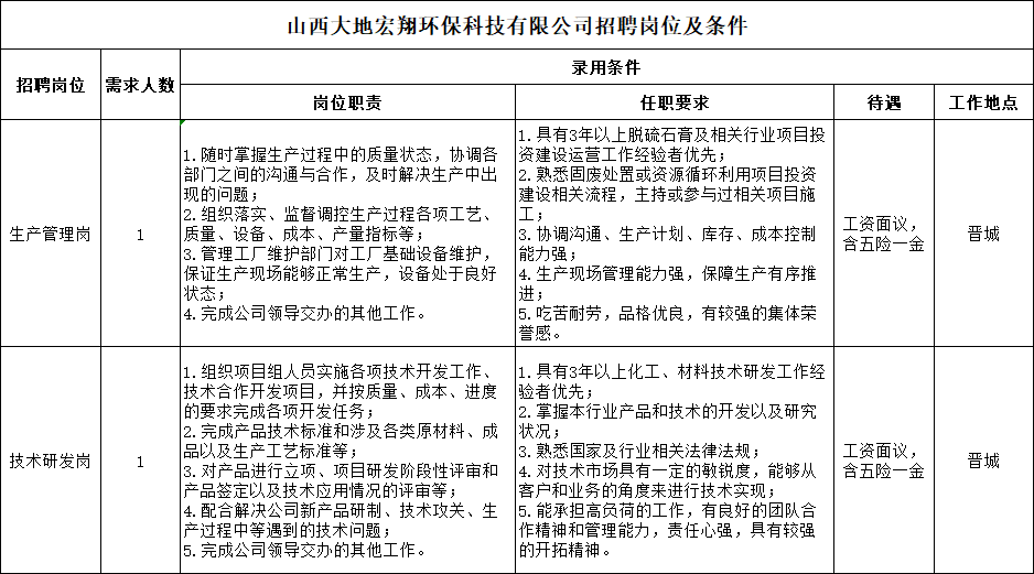 为适应山西大地宏翔环保科技有限公司(以下简称:“大地宏翔公司”)全方位高质量发展的需要,根据实际工作需求,现面向社会公开招聘工作人员2名(生产管理岗1名,技术研发岗1名),现就有关事项公告如下: