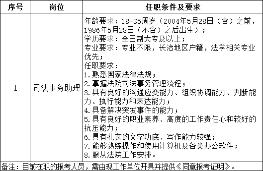 根据工作需要,长子县人民法院委托山西威廉体育人力资源派遣有限公司,面向社会公开招聘 2 名司法辅助人员(司法事务助理 2 名),现将有关事项公告如下。