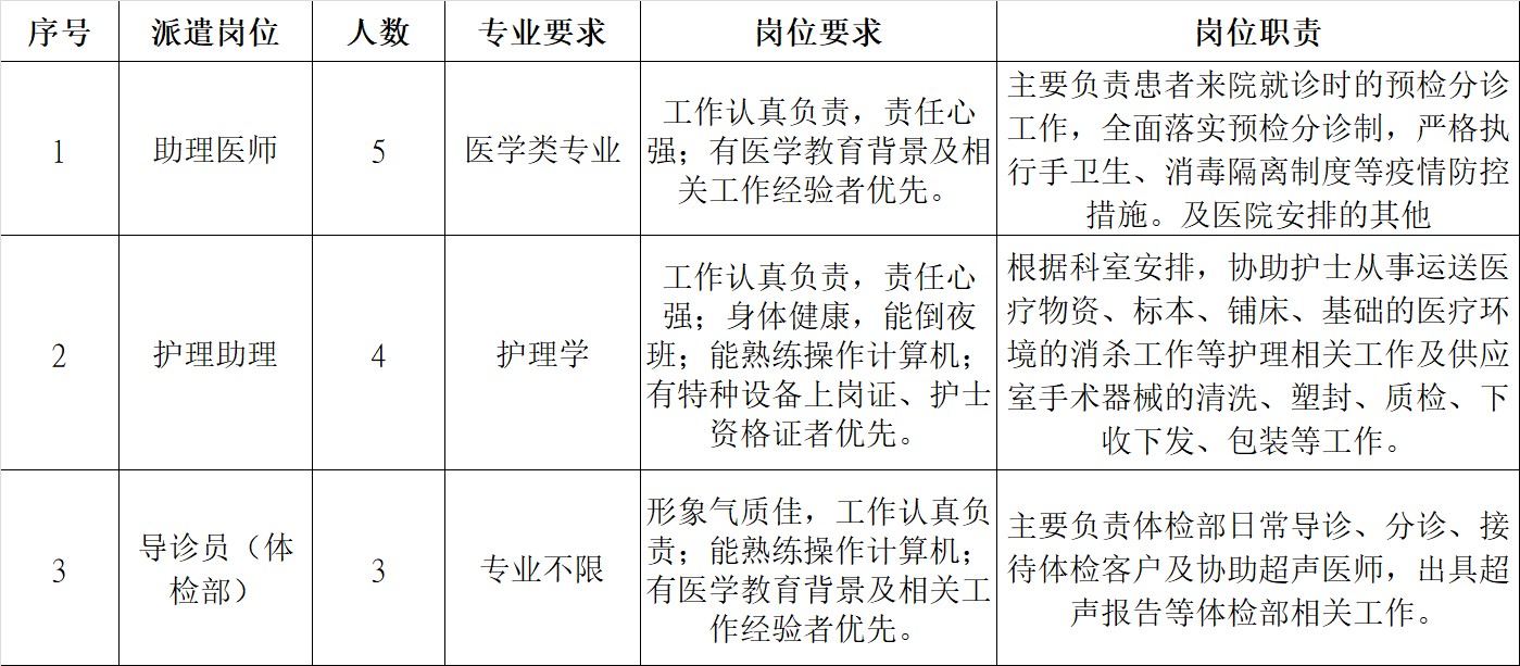 为满足山西省煤炭中心医院发展需求,根据医院工作需要,特委托山西威廉体育人力资源派遣有限公司(以下简称:“威廉体育人力资源公司”)面向社会公开招聘劳务派遣制工作人员12名,现就有关事项公告如下: