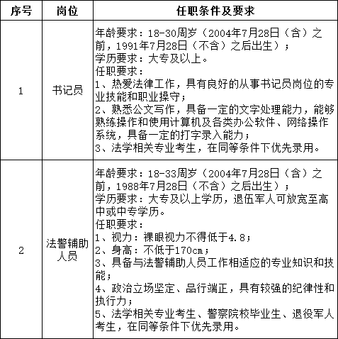 1、法警辅助人员年龄要求:18-33周岁(2004年7月28日(含)之前,1988年7月28日(不含)之后出生);