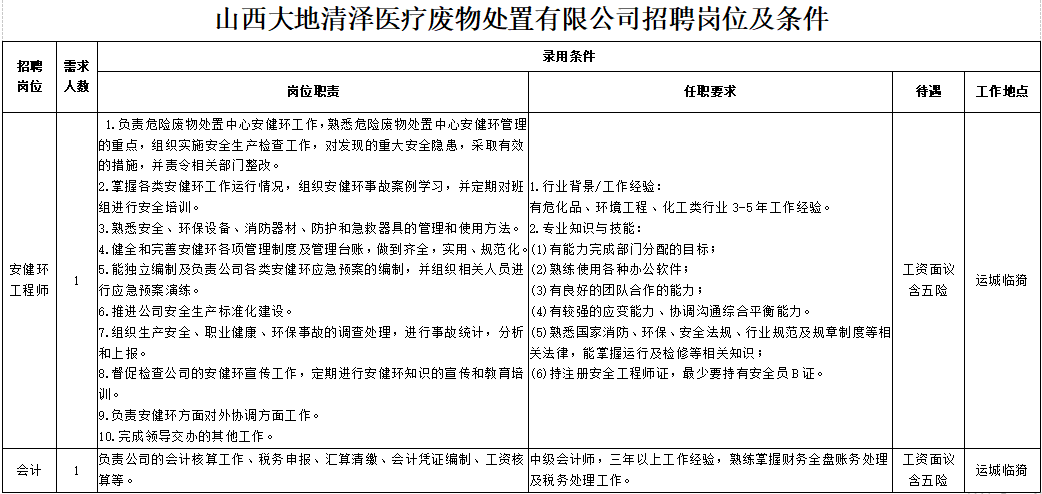 为适应山西大地清泽医疗废物处置有限公司(以下简称:“大地清泽公司”)全方位高质量发展的需要,根据实际工作需求,现面向社会公开招聘工作人员2名(安健环工程师1名,会计1名),现就有关事项公告如下: