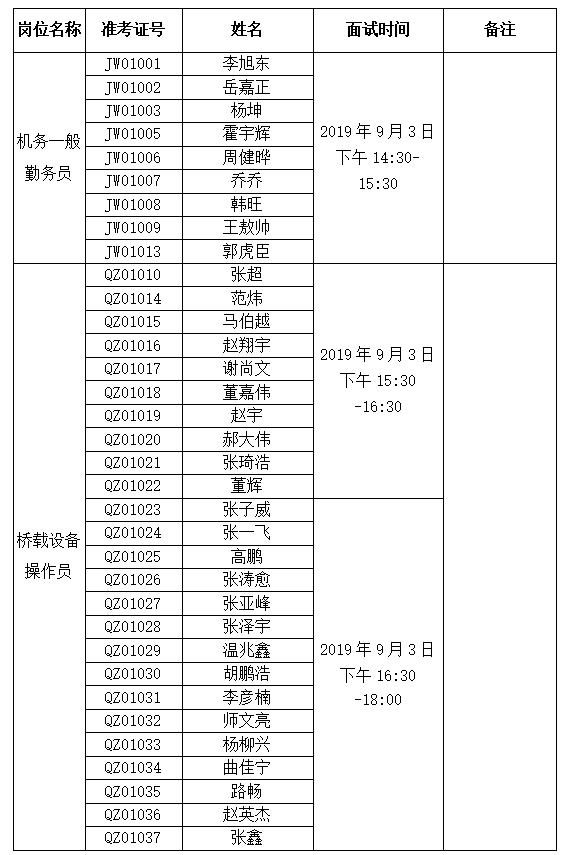 根据太原机场2019年公开招聘劳务派遣制机务一般勤务员、桥载设备操作员的要求,现就各岗位面试有关事宜通知如下: