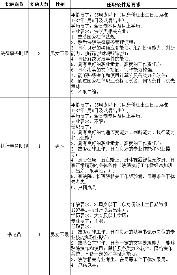 根据工作需要,山西威廉体育人力资源派遣有限公司(以下简称:威廉体育人力资源公司)受岚县人民法院委托,面向社会公开招聘5名司法辅助人员,其中法律事务助理3名、执行事务助理1名、书记员1名,现将有关事项公告如下: