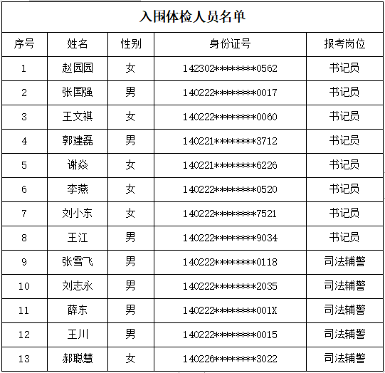 根据天镇县人民法院2022年招聘司法辅助人员的相关要求,经过线上报名、资格审查、笔试、听打测试(体能测试)、面试等环节,现就体检有关事项通知如下: