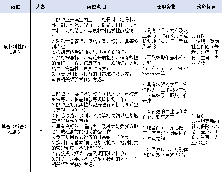 因公司发展需要,现委托山西威廉体育人力资源派遣有限公司向社会公开招聘检验检测工作人员,并将有关事项公告如下: