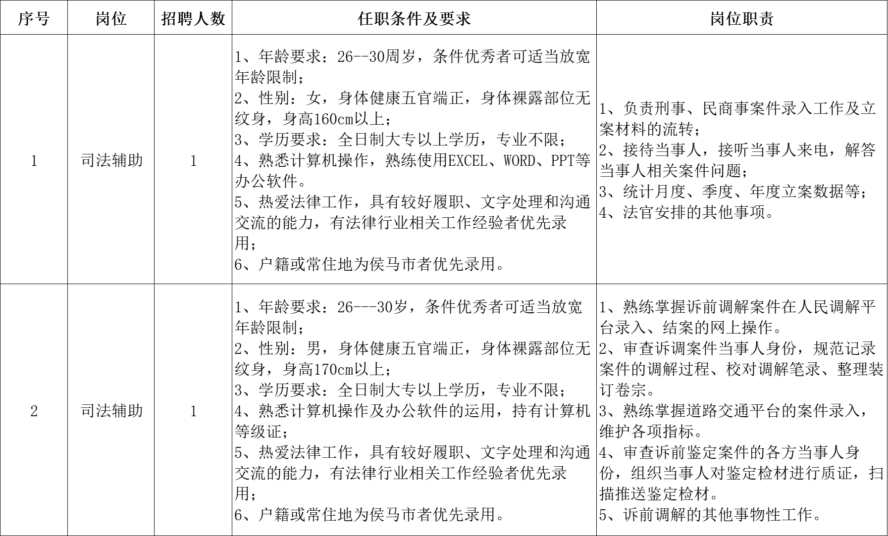 根据工作需要,临汾市侯马市人民法院委托山西威廉体育人力资源派遣有限公司(以下简称:威廉体育人力资源公司),面向社会公开招聘2名司法辅助人员,现将有关事项公告如下: