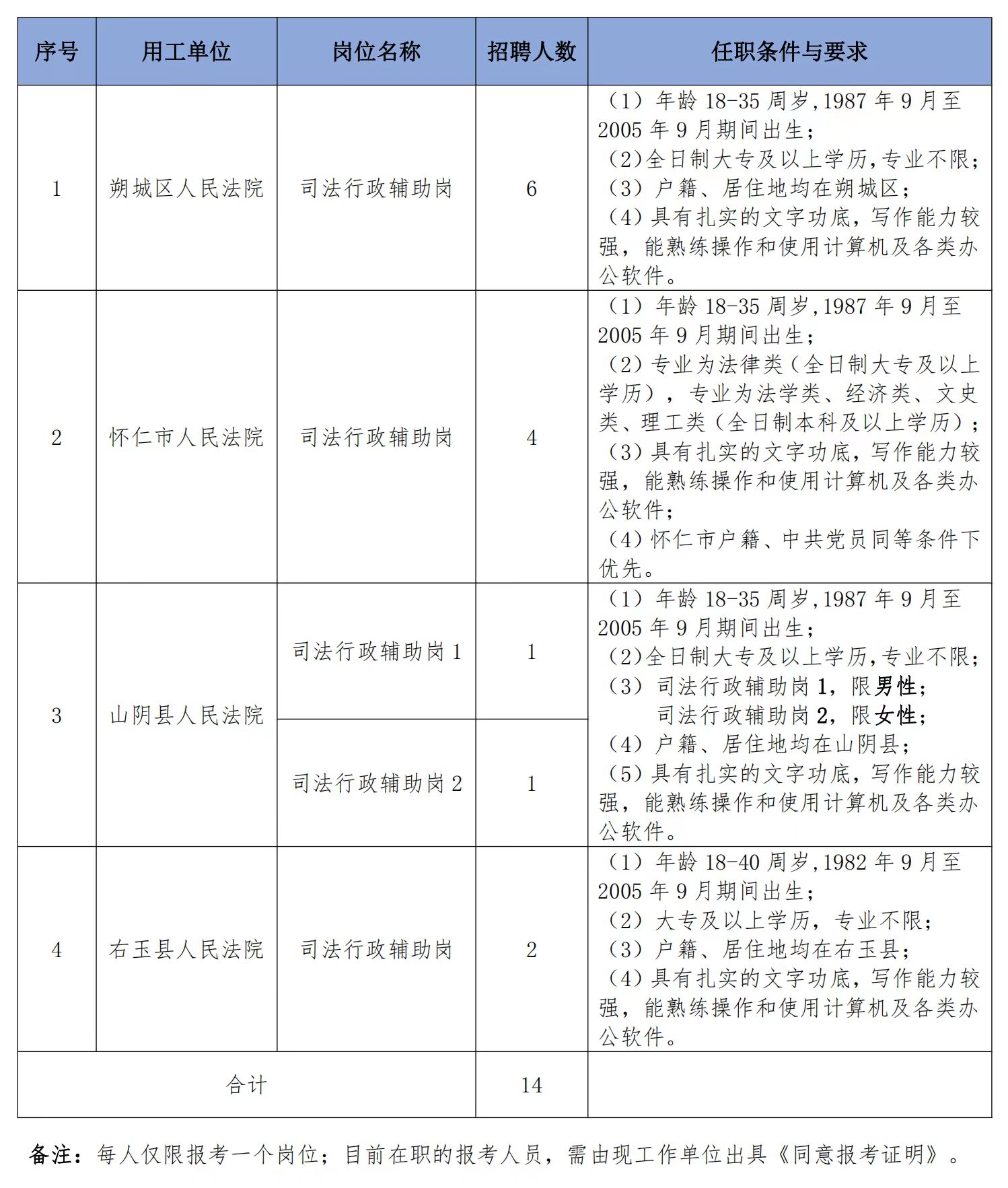 因工作需要,山西威廉体育人力资源派遣有限公司受朔州市中级人民法院委托,面向社会公开招聘14名司法行政辅助人员,并派往朔州市各基层人民法院工作。现将有关事项公告如下: