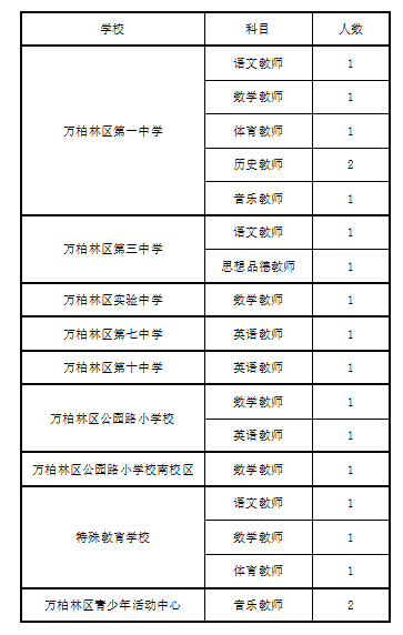 因万柏林区第一中学、第三中学、实验中学、第七中学、第十中学、公园路小学校及公园路小学校南校区均有教师离职,为满足学校教学需要,介于学校特殊情况,不空缺岗位影响正常教学,现为各学校补充招聘政府购买服务教师,具体公告如下: