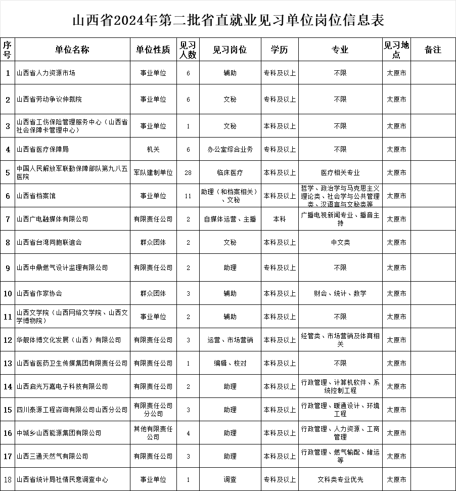 同时,7月17日上午9点-12点,将在山西省人力资源市场 (太原市新建南路81号) 组织召开现场对接(招聘)会,有意者请登录山西省人社厅网站人社一体化公共服务平台,在“公共就业”一栏,“就业见习岗位”版块查询相关信息,在线申请就业见习。详情咨询省人才资源市场。联系人:赵兴娥联系电话:0351-8288018附件:山西省2024年第二批省直就业见习单位岗位信息表山西省人力资源和社会保障厅