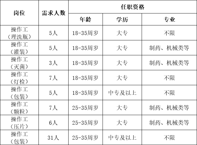 山西某药业公司,是一家历史悠久的综合性药品生产企业,致力于为社会提供高质量的医药产品。为了提高生产效率和产品质量,在激烈的市场竞争中保持领先地位,由山西威廉体育人力资源派遣有限公司招聘药品包装工、车间操作工共69名,现将有关事项公告如下:
