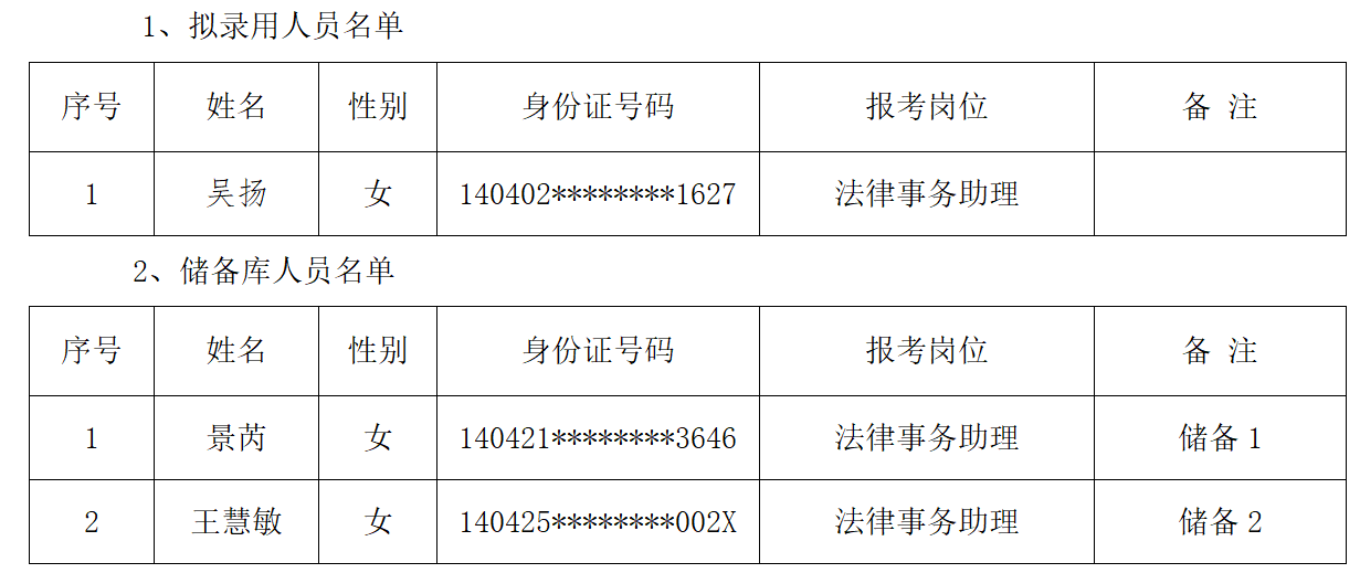 根据《长治市潞州区人民法院2025年法律事务助理招聘公告》相关要求,经过报名、资格审查、理论考试、面试、体检、政审等环节,现将拟录用人员及储备人员名单公示如下: