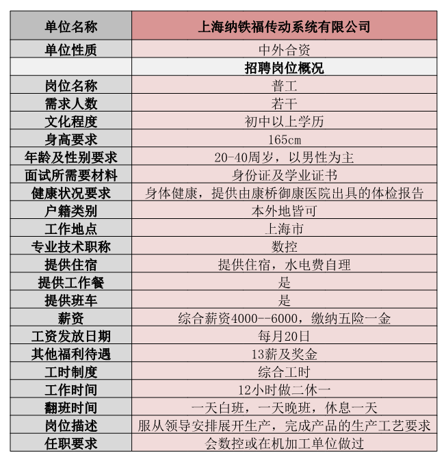 根据工作需要,上海纳铁福传动系统有限公司招聘普工若干名,现将有关事项公告如下: