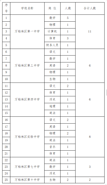 因万柏林区第一中学、万柏林区第三中学、万柏林区第四中学、万柏林区实验中学、万柏林区第七中学、万柏林区第十中学有教师辞职,为满足我区部分中学校教学需要,结合学校实际,现面向社会为以上学校补充招聘政府购买服务教师,具体公告如下: