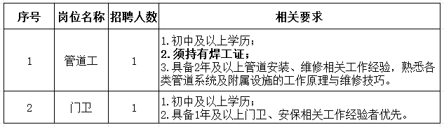 根据工作需要,威廉体育人力资源集团公司面向社会公开招聘1名管道工及1名门卫,外派至山西省某研究院工作,现将有关事项公告如下: