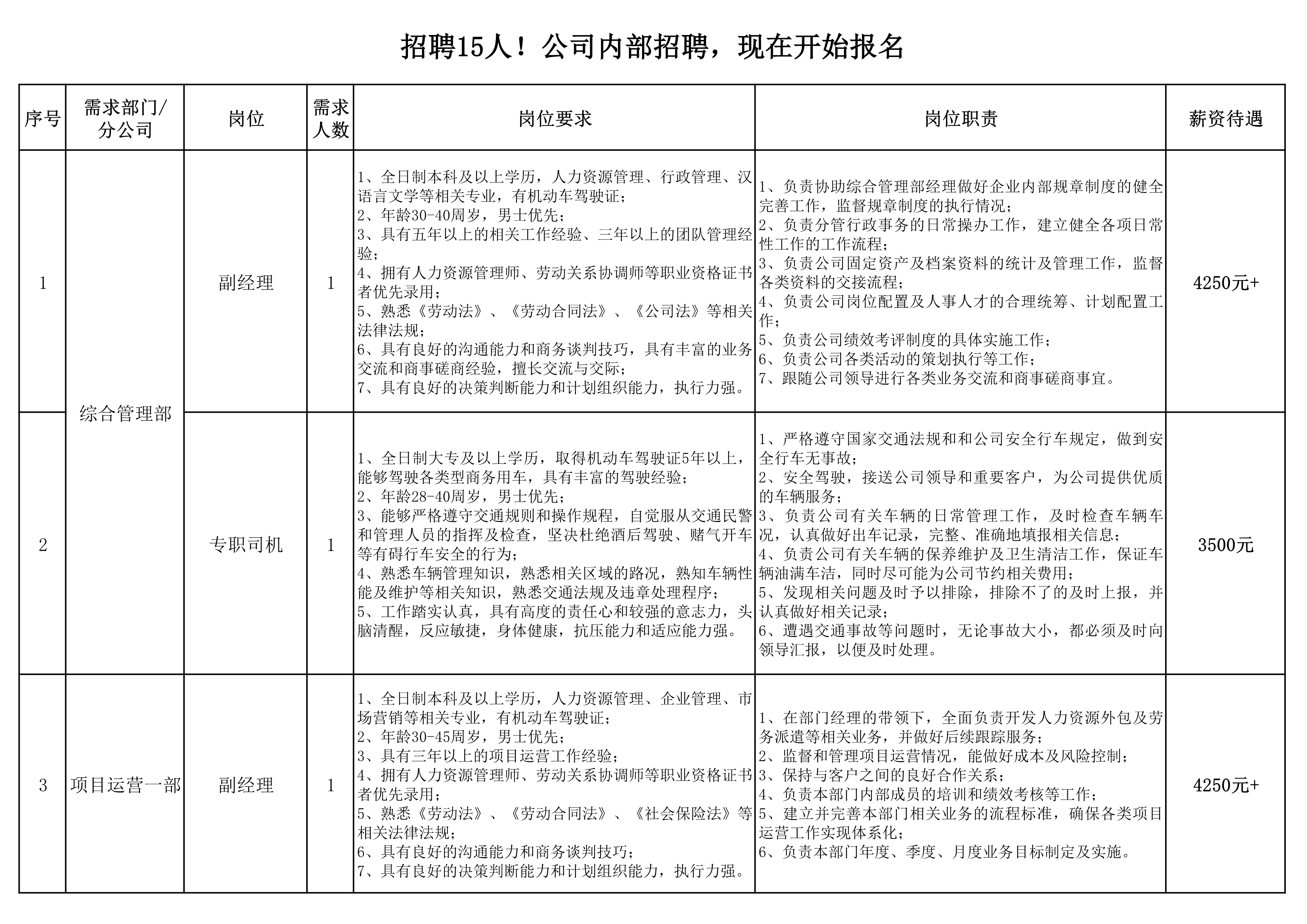 因公司发展及业务拓展需要,我公司拟面向社会公开招聘员工15名,现将有关事项公告如下: