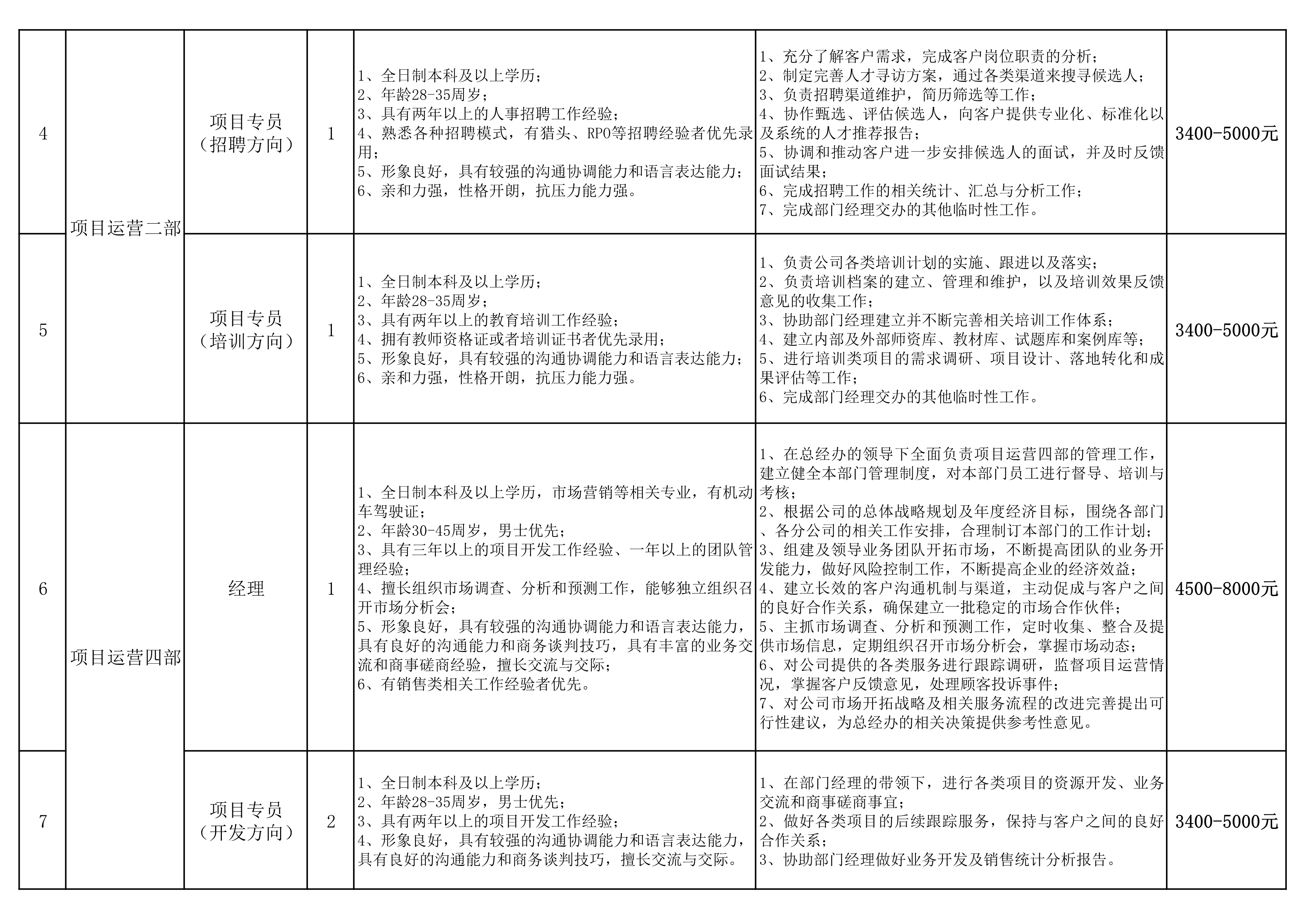 项目运营二部:项目专员(招聘方向)1名,项目专员(培训方向)1名;