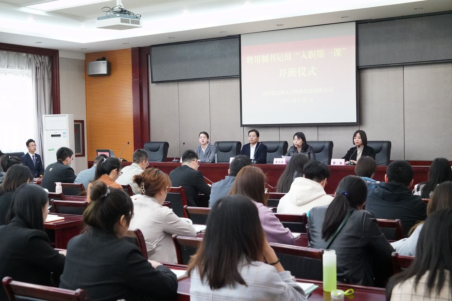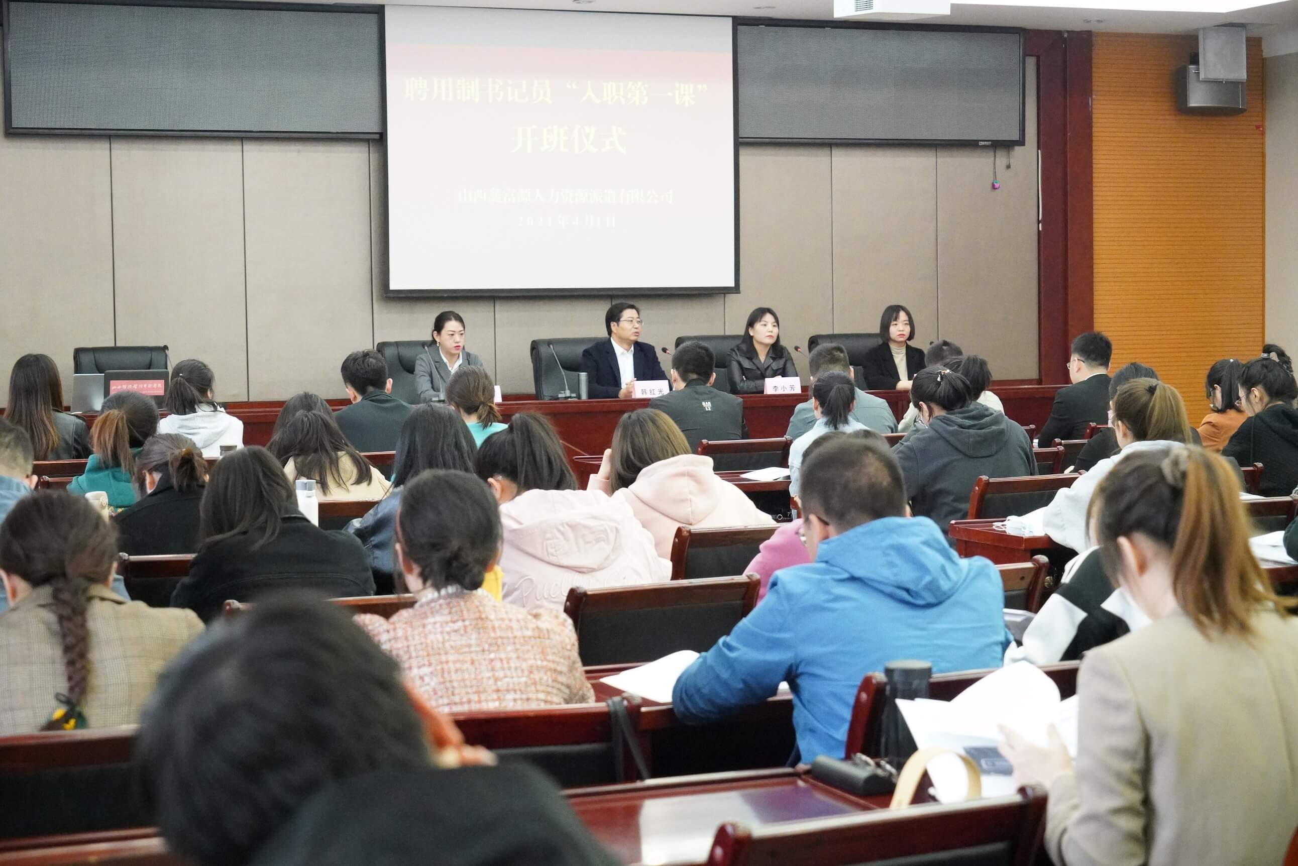 2021年4月1日上午,山西威廉体育人力资源派遣有限公司在山西经济管理干部学院举行了新录用聘用制书记员初任培训开班仪式。公司董事长韩红光、总经理李小芳、党支部书记曹幸、工会主席刘莉,及101名新入职的聘用制书记员参加了开班仪式。