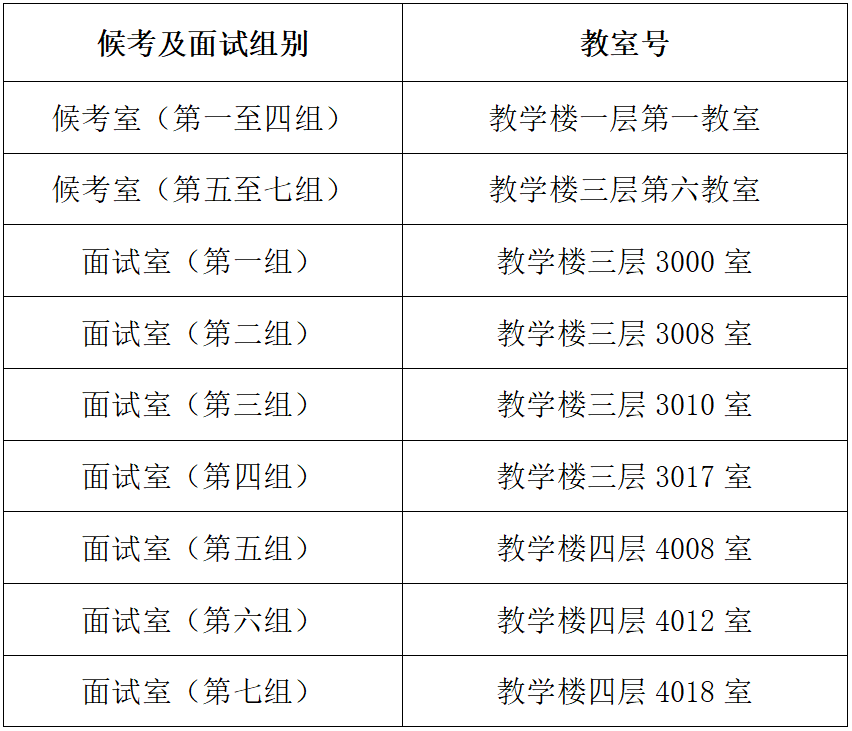 本次面试分七组同时进行,请入围考生务必按照名单中所在组别候考、面试。