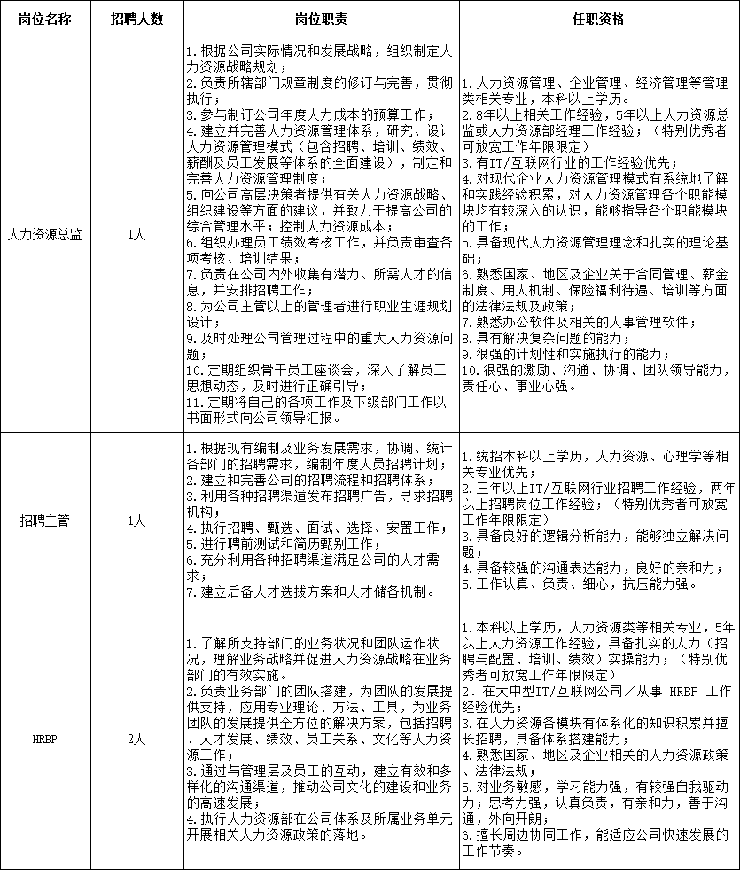 2.薪资待遇:人资总监:年薪15万—20万;招聘主管:4K—6K;HRBP:6K—8K;