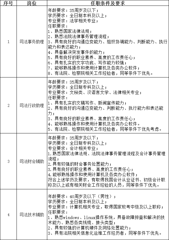 根据工作需要,山西威廉体育人力资源派遣有限公司(以下简称:威廉体育人力资源公司)受吕梁市中级人民法院委托,面向社会公开招聘18名派遣制司法辅助人员,其中司法事务助理10名、司法行政辅助(人事管理2名,文秘4名)6名、司法财会辅助1名、司法技术辅助1名,现将有关事项公告如下: