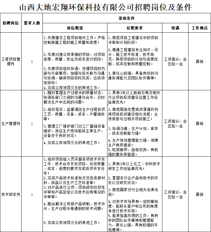 为适应山西大地宏翔环保科技有限公司(以下简称:“大地宏翔公司”)全方位高质量发展的需要,根据实际工作需求,现面向社会公开招聘工作人员3名(其中工程项目管理岗1名,生产管理岗1名,技术研发岗1名),现就有关事项公告如下: