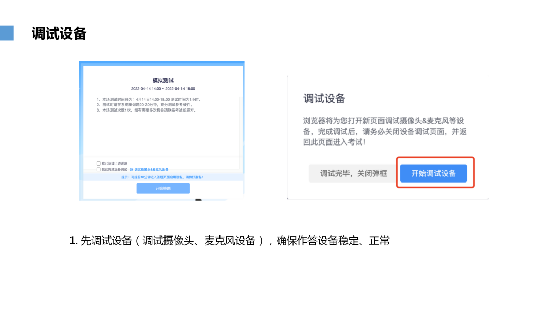 1、在正式开始考试前,请考生提前准备好本人身份证,并将设备调试到最佳状态。考试过程中由于设备硬件故障、断电断网等导致考试无法正常进行的,由考生自行承担责任。